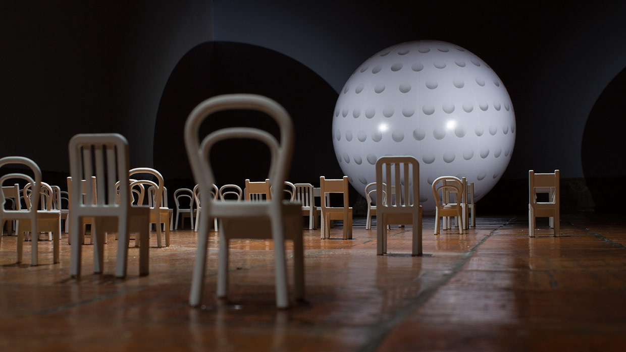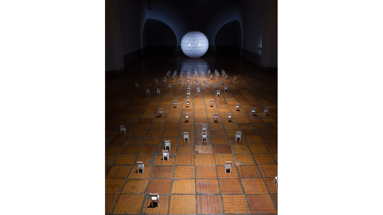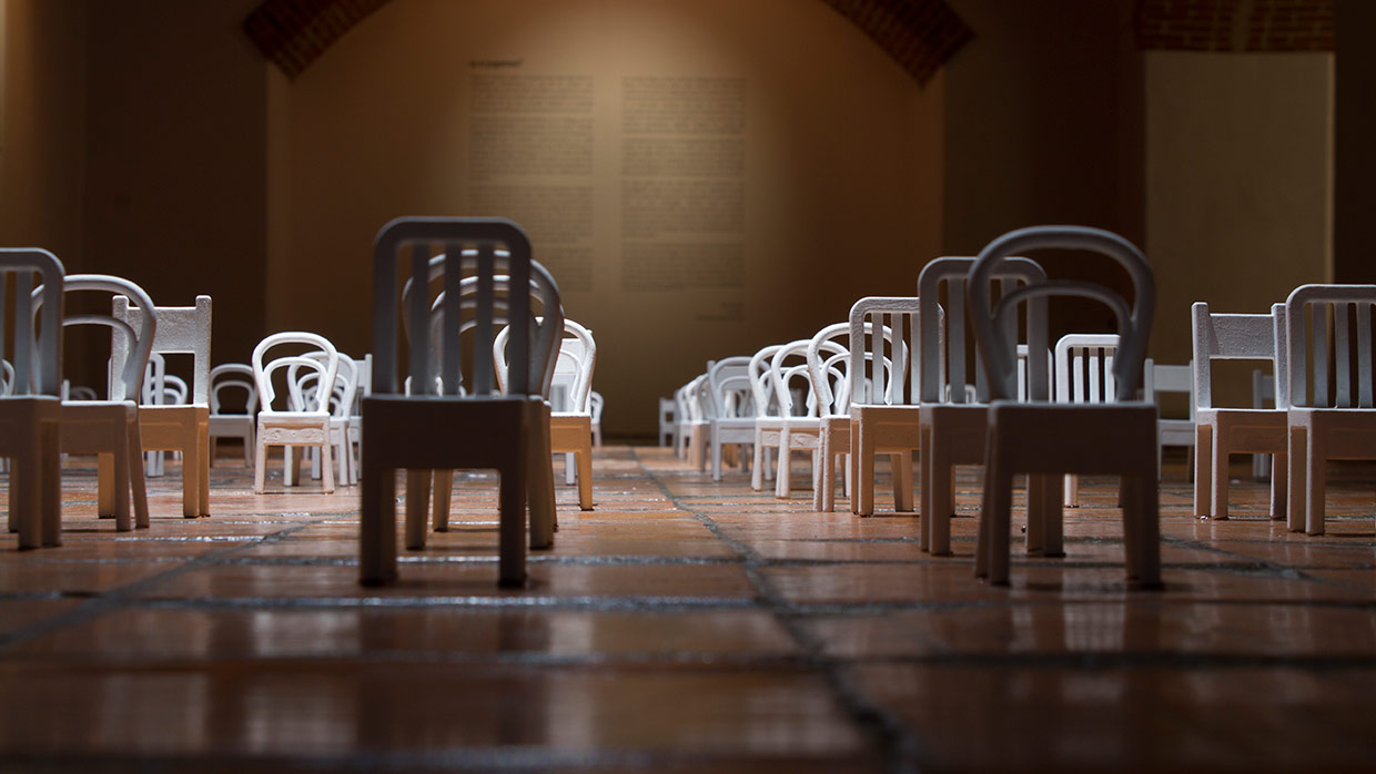 Por otra parte, en las obras podemos reconocer una investigación sobre la escala como un elemento formal dentro el arte, pero que en la propuesta se convierte más bien en una estrategia artística para cuestionar conceptualmente el poder sobre los humanos. Los cambios de escala nos invitan a interrogarnos sobre nuestra relación individual y existencial con la historia, el paisaje y la política. Pequeñas sillas que dialogan formal y conceptualmente con grandes espacios.